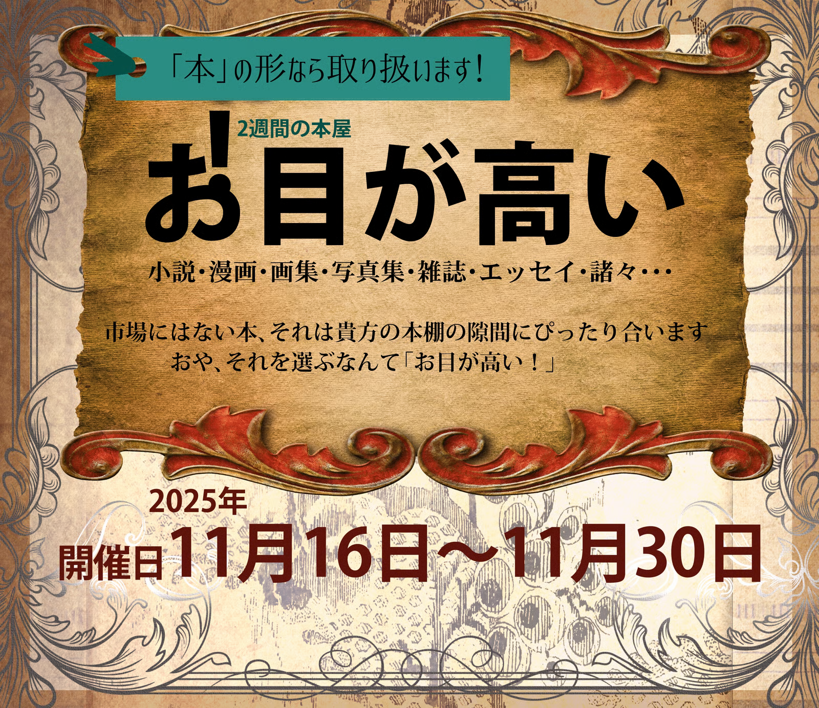 11/16~30開催《2週間の本屋 お目が高い》於Gallery CafeBar冥(大阪)に参加します ブログを更新しました。 11/16~30開催《2週間の本屋 お目が高い》於Gallery CafeBar冥(大阪)に参加します